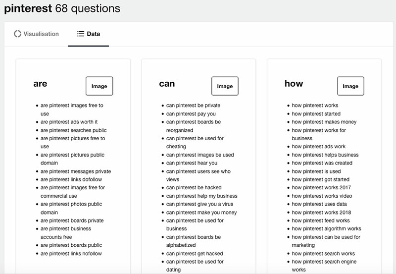 It uses the suggested search results from Google to compile the list. You will have experienced ‘Suggested Search’ when typing something into Google. As you type, Google provides a drop-down list of suggested searches.